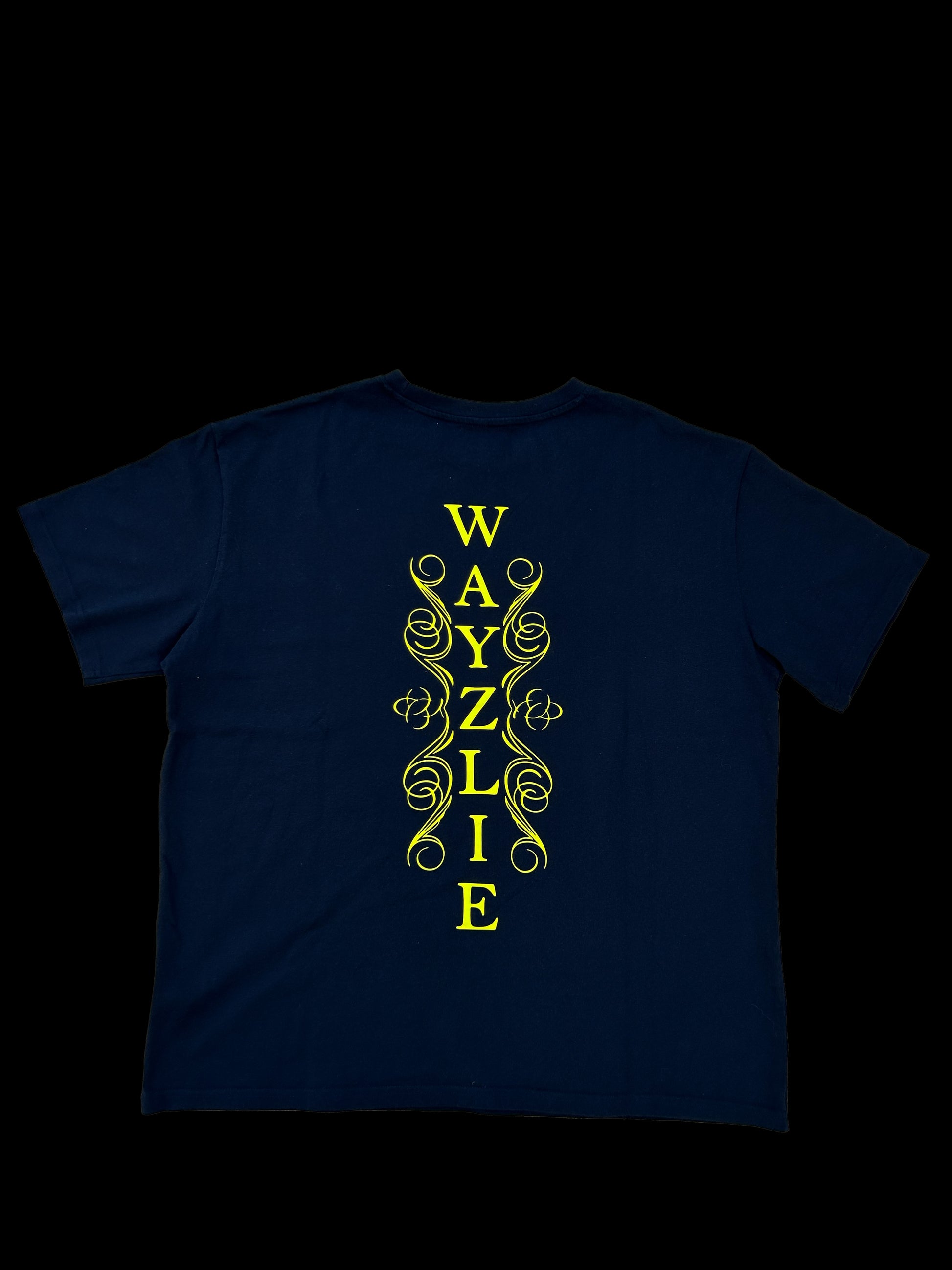 Made with a deep navy cotton base and oversized cropped silhouette, this tee delivers comfort with statement graphics. On the chest sits a golden crest emblem featuring the Wayzlie mark, nodding to prestige and strength. The back carries bold vertical “WAYZLIE” lettering framed by intricate scrollwork, giving a gothic-yet-contemporary edge.